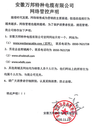 鄭重聲明:安徽萬邦特種電纜有限公司官方網站為:www_wanbangcable_com.dingxinsl.cn,除此之外無任何子網站或合作網站,其余均為假冒偽劣。電話:0550-7621728 13485756353 地 址:安徽省天長市滁州高新技術產業開發區經四路29號